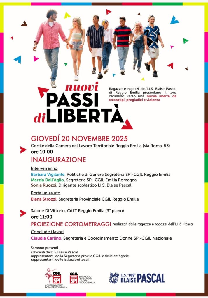 Giovedì 20 novembre, alle ore 10:00, lo Spi Cgil, all’interno della Corte della Camera del Lavoro, inaugurerà la mostra “Nuovi passi di libertà. Ragazze e ragazzi dell’IIS Bus Pascal presentano il loro cammino verso una nuova libertà da stereotipi, pregiudizi e violenza”.