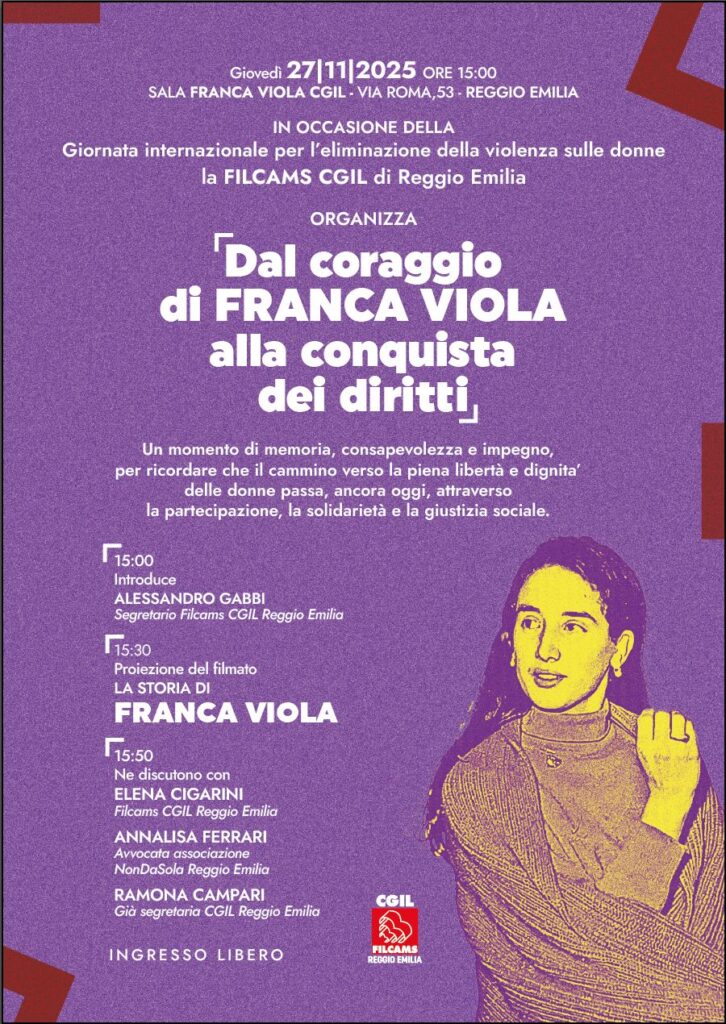 Giovedì 27 novembre alle ore 15:00 la Filcams Cgil terrà il convegno “Dal coraggio di Franca Viola alla conquista dei diritti” nella sala della Camera del Lavoro che anni fa la Cgil ha voluto dedicare proprio alla figura di Franca Viola.