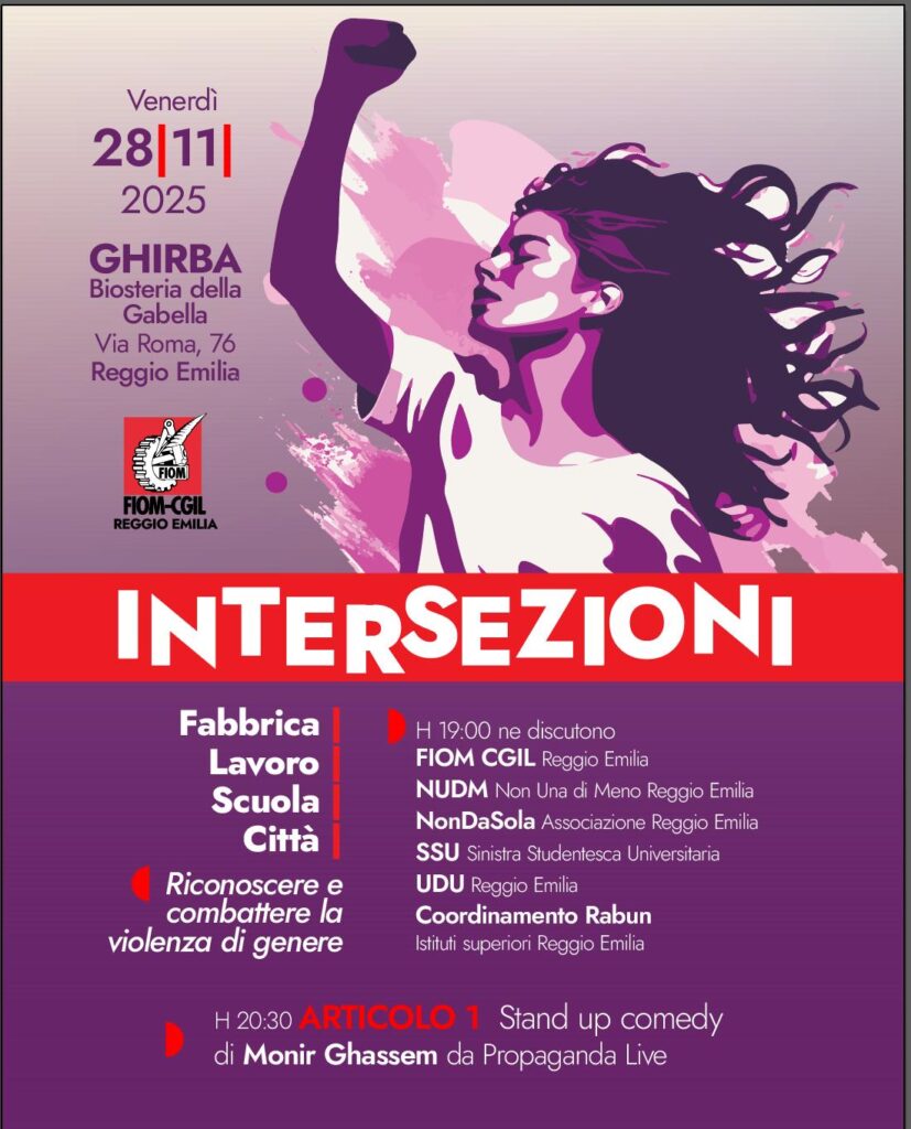 Infine, venerdì 28 novembre alle ore 19:00 la Fiom promuove, negli spazi di Ghirba in Via Roma, l’incontro dal titolo “Intersezioni. Riconoscere e combattere la violenza di genere” che vede la partecipazione di numerose realtà territoriali in dialogo sul tema. La serata si concluderà con la performance Articolo 1, stand up comedy di Monir Ghassem da Propaganda Live.