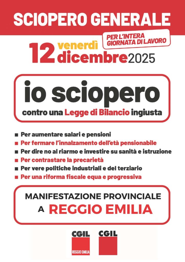 Venerdì 12 dicembre 2025, a Reggio Emilia come nel resto del Paese, sciopereremo per l’intera giornata di lavoro contro una Legge di Bilancio profondamente ingiusta.