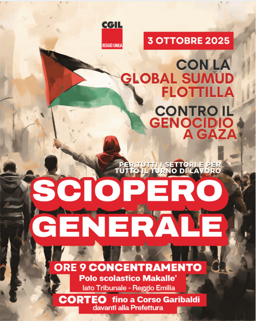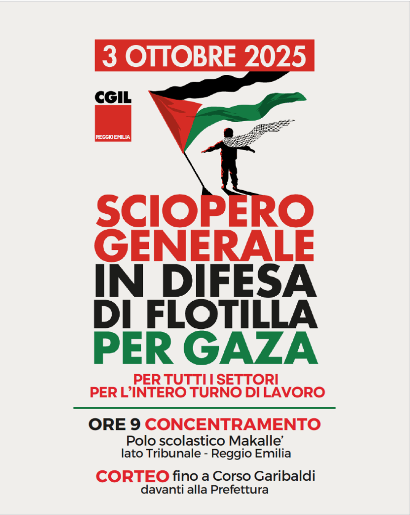 “L’aggressione contro navi civili che trasportavano cittadine e cittadini italiani, rappresenta un fatto di gravità estrema. Un colpo inferto all’ordine costituzionale stesso che impedisce un’azione umanitaria e di solidarietà verso la popolazione palestinese sottoposta dal governo israeliano ad una vera e propria operazione di genocidio. Un attentato diretto all’incolumità e alla sicurezza di lavoratrici e lavoratori, volontarie e volontari imbarcati. Non è soltanto un crimine contro persone inermi, ma è grave che il governo italiano abbia abbandonato lavoratrici e lavoratori italiani in acque libere internazionali, violando i nostri principi costituzionali”. Con queste parole la Cgil annuncia, in difesa di Flotilla, dei valori costituzionali e per Gaza, lo sciopero generale nazionale di tutti i settori pubblici e privati per l’intera giornata di venerdì, 3 ottobre, ai sensi dell’art.2, comma 7, della legge n.146/90.