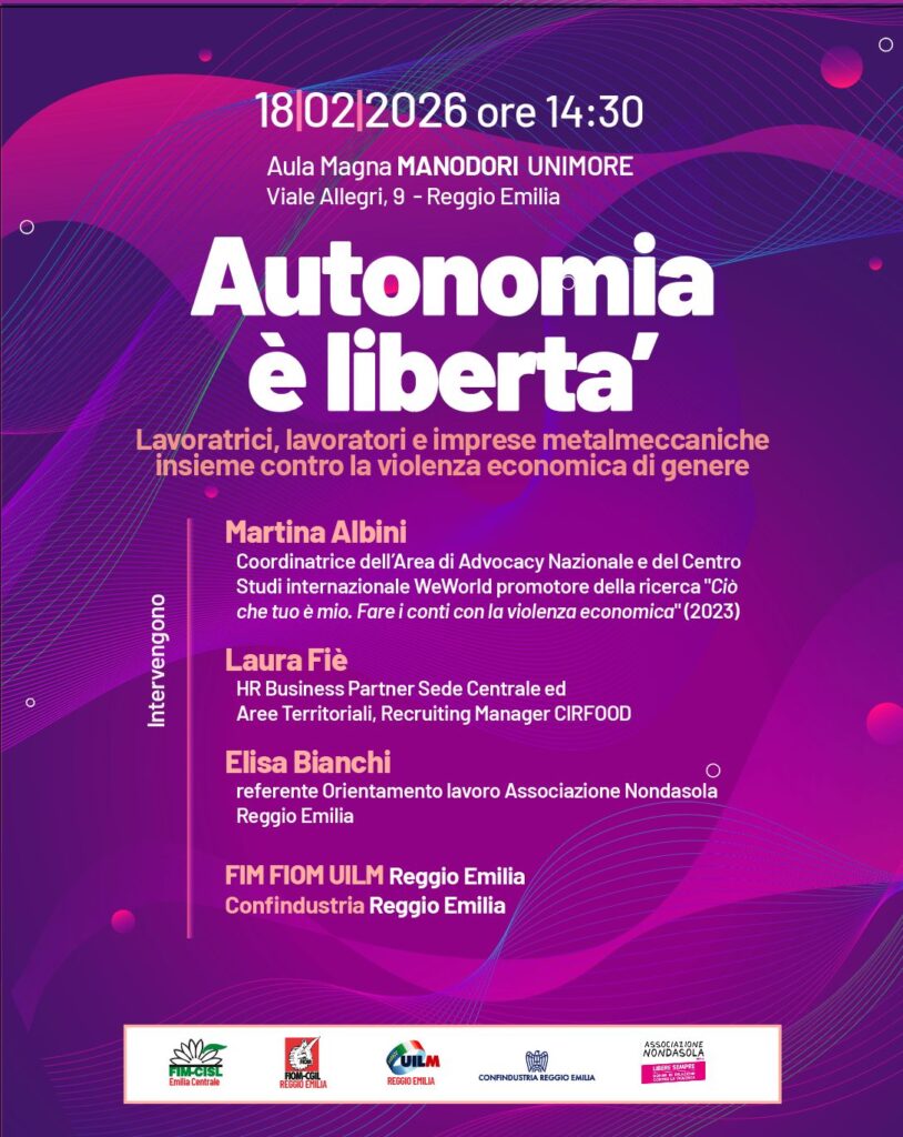 Si è svolta oggi pomeriggio, presso l’Aula magna Manodori dell’Università di Modena e Reggio Emilia, l’iniziativa “Autonomia è libertà. Lavoratrici, lavoratori e imprese metalmeccaniche contro la violenza economica di genere”, promossa dall’Associazione Nondasola – Centro antiviolenza – da Fiom Cgil Fim Cisl Uilm Uil e Confindustria Reggio Emilia.