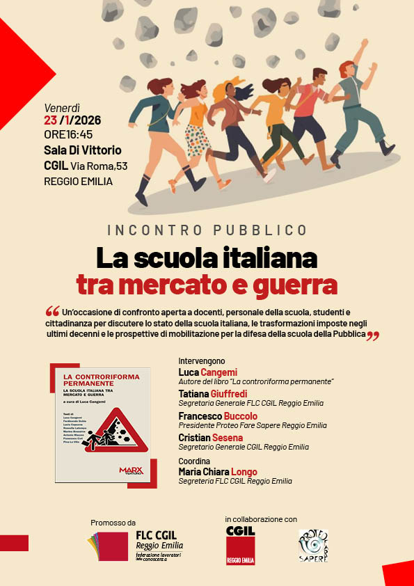 Con quest’obiettivo la Flc Cgil di Reggio Emilia, in collaborazione con la Camera del Lavoro e Proteo Fare Sapere, promuove la presentazione del libro “La controriforma permanente. La scuola italiana tra mercato e guerra”, a cura di Luca Cangemi, professore di filosofia e storia scuola secondaria di secondo grado e dottore di ricerca in scienze politiche.